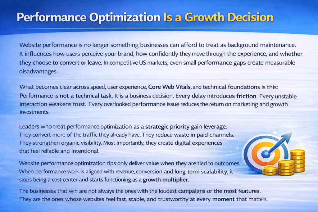 Website performance optimization tips only deliver value when they are tied to outcomes. When performance work is aligned with revenue conversion and long term scalability it stops being a cost center and starts functioning as a growth multiplier.