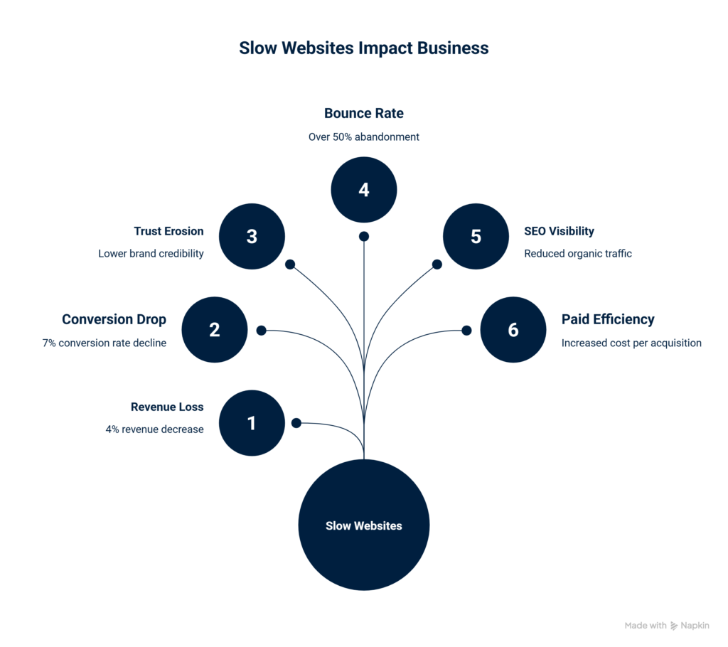 What really matters here is not the numbers alone. It is the pattern. Slow websites leak revenue before a sales conversation begins. They damage trust before a brand message is absorbed. They weaken SEO before competitors even need to outspend you.