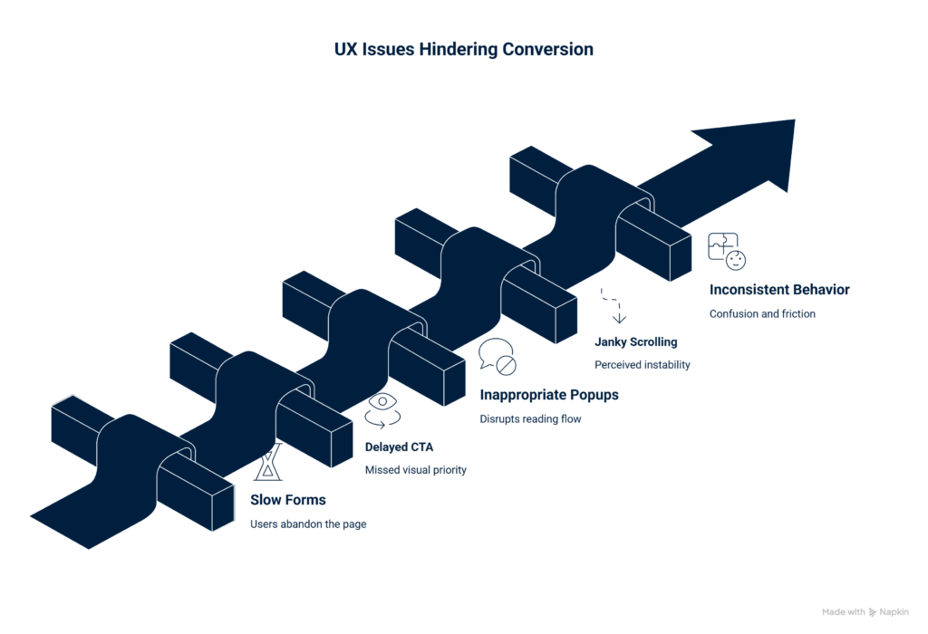 Forms that load after the rest of the page often lose users before interaction begins. Calls to action that appear too late or shift position lose visual priority. Popups that interrupt reading flow break trust rather than build interest.